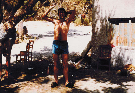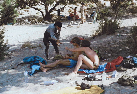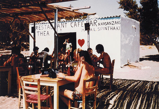 What did we do? Not very much. Being. Socializing, sex, intoxication, nature. Visual images that stands out in my memory are the Café at all times of day and the atmosphere and the music there, the outdoor shower mounted from a branch in a tree close to the Café, the donkey coming in with supplies from a neighbouring village in the morning, and the old man selling fresh figs on the beach. I also remember there was talk of police raids. Mainly for drugs, but also for propriety, as the police squad went around the beach and commanded the girls to put their tops back on. Archetypical squares and party-poopers! One single hour I remember vividly was renting a kayak on the beach. A storm was coming in and the kayak people were doubtful that it was safe to rent them out. Safe or not, they did, and we had the time of our lives, laughing continuously as the waves jolted the kayaks around in a turbulent unio mystica with nature. Because the waves were often quite tremendous the ordinary bathing experience seemed like a combination of California surfing and the advertisement for Old Spice aftershave. You could see a wall of water rising before and over you, and then you were swallowed up by the wave and chaotically tumbled around only to reach your orientation and stability just before the next wall of water came, in an endless circle of pure fun. That roller-coaster bathing experience was about the only activity, the rest was nature, relations and discussion with other people, and leisure.