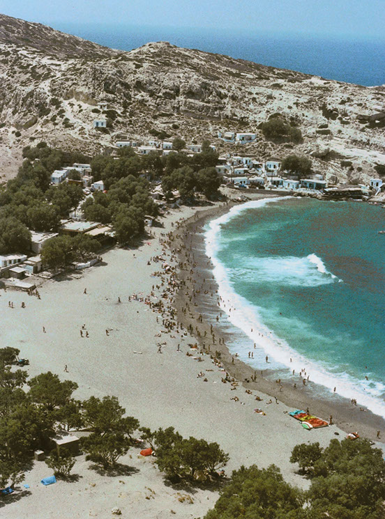 Getting to Matala was not only reaching a place of natural beauty, but also reaching a mythical place. Having just finished the mandatory introductory course in philosophy, logic and psychology at the University of Oslo, the presence of the caves lent a Platonic aura to the place. The caves also added a fascinating primeval element. Caves are the first human dwellings, the ur-house. In addition, these particular caves had been used as burial grounds since the times of Zeus himself. Incredible what cosmic powers and historical past one could connect with here! It was not possible to inhabit the caves in 1976-1977, but it was possible to stay there during the day. We made our camp right on the beach, behind the thin shelter of some small trees only 50 meters or so from the water, enabling us to hear the rhythmic splashing of the sea, and the sound of the retreating pebbles -